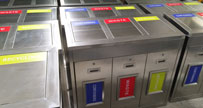 這是欣方圳為中山港資企業生產的不銹鋼三分類垃圾箱,首選被吸引眼球的是這紅黃藍三色貼紙,內容為英文字母,清晰醒目,還怕垃圾分類投放不精準嗎?國家大力推行垃圾分...