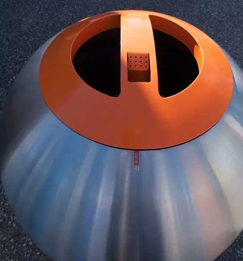 投放口在球身頂部,圓環形的口蓋顏色可以隨意搭配選擇,就目前所見,在德國柏林采用了醒目的橙色,在荷蘭皮爾默倫德采用了低調的黑色。蓋子上細心設計了一小塊凹槽作為公共煙灰缸專供行人在這里站立吸煙并放置掐滅了的煙蒂。