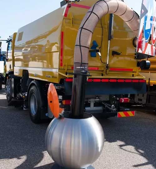 該系統配有專用工作車輛,在車身背后配掛一根超長的管子,掀開泡泡垃圾桶的蓋子,司機取下管子,把管子從上方放入圓球,利用產生高效的空氣旋渦,就像一臺強勁的吸塵器快速把垃圾集速吸走。這樣一來,既減少了管理上的人工、物耗,又不會造成路面多余的污漬痕跡。
