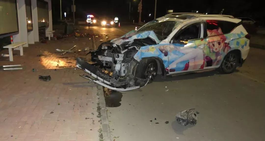 萬幸的是,車上的安全氣囊都及時打開了,盡管車上四人嚇得魂飛天外,但身體都沒啥大礙,只有司機譚某的左手有些輕微擦傷。陳警官趕到現場,只見一輛粵CT××33比亞迪小車打橫停靠路邊,臭烘烘的垃圾撒了一地,垃圾桶倒在一邊,交通指示牌和警示樁也被撞得連根拔起,情況比預想的要嚴重得多。陳警官發現,小車車前蓋和兩側車身貼滿了動漫美少女貼膜,但由于撞擊,原本萌萌的美少女此時變得有些猙獰。
