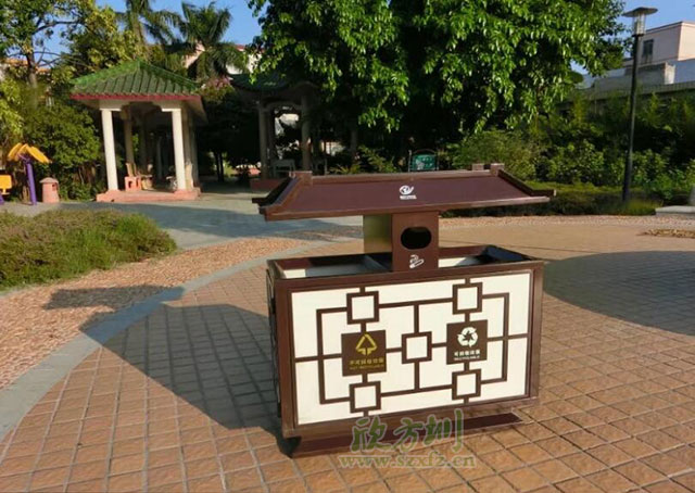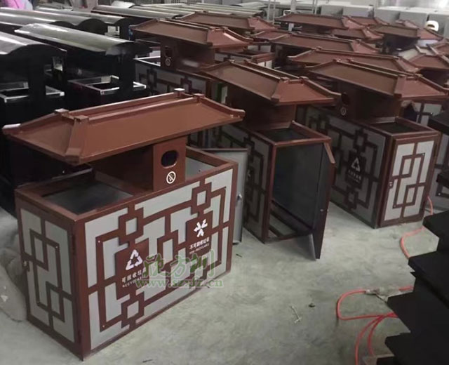中國(guó)風(fēng)戶外鋼制分類垃圾桶工廠批量生產(chǎn)圖