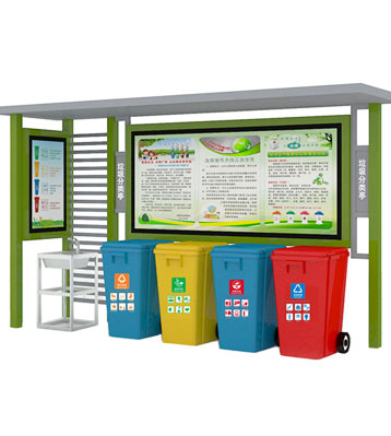 設有擋雨棚,可配備垃圾箱信息顯示屏、防水照明燈、廣告屏,進行地面硬化。對社區玻金塑紙可回收物,其他垃圾,廚余垃圾,有害垃圾等生活垃圾定時定點投放收集.